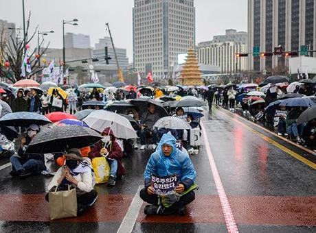 Yonhap’ın haberine göre, Yoon’un görevinden alınmasına hükmeden mahkeme kararına karşı çıkan kalabalık grup, şiddetli yağmura rağmen Seul’ün Gwanghwamun bölgesinde sokaklara çıktı.